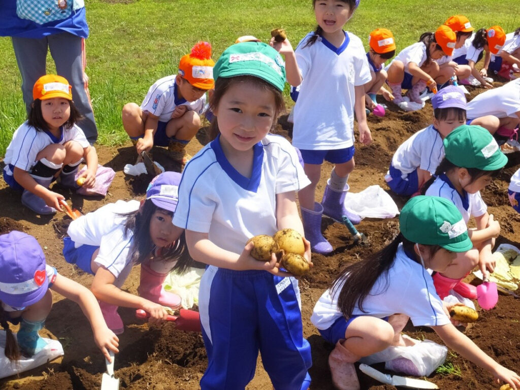 園舎から徒歩10分くらいのところに第2グラウンドがあり、ジャガイモを育てたり、課外教室のサッカークラブで使っています。年長さんのお泊り保育では、自分たちで育てたジャガイモをつかってカレーライスを作ります。