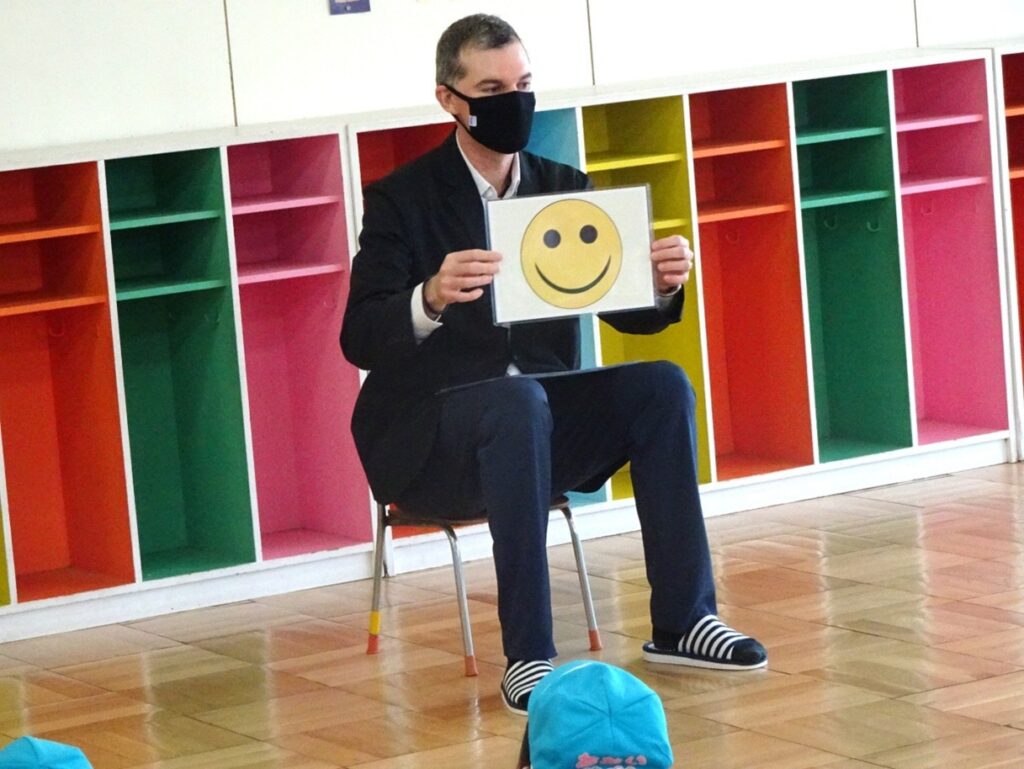 課外教室の外国人講師による英語あそびの時間を設けています。カードなどを使って理解を深めたり、体を動かして感情表現を覚えたり、コミュニケーションの基礎を楽しく体験しています。
