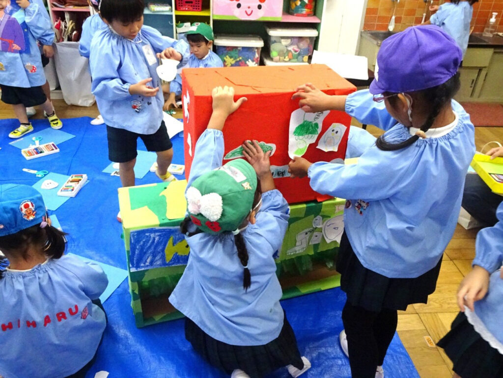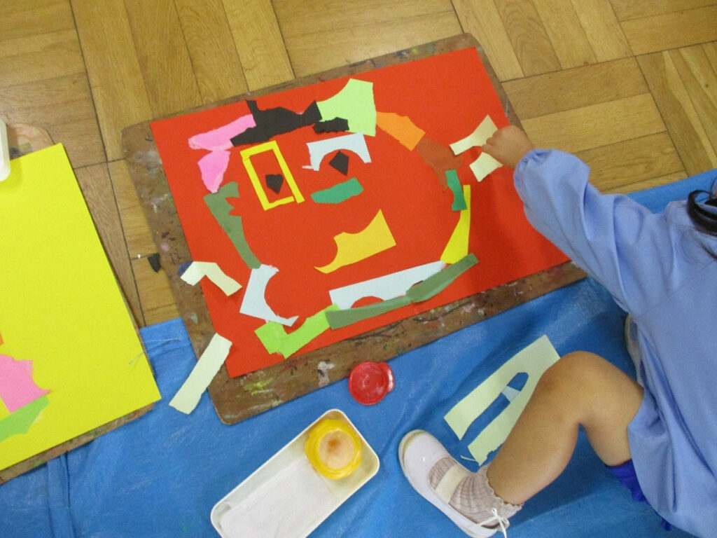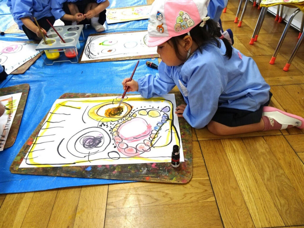 豊かな想像力を育み、自由にのびのびと表現できるよう、絵画指導に力を入れて取り組んでいます。主にクレパスや絵の具で、体全体を使って大きく描けるよう指導します。貼り絵にも挑戦します。毎年、世界児童画展では多くの入選作品が選ばれ、絵画を通した国際交流にも貢献しています。