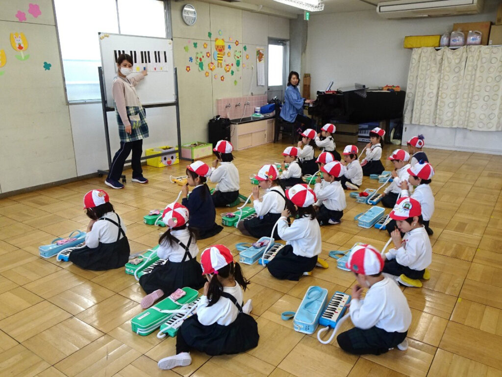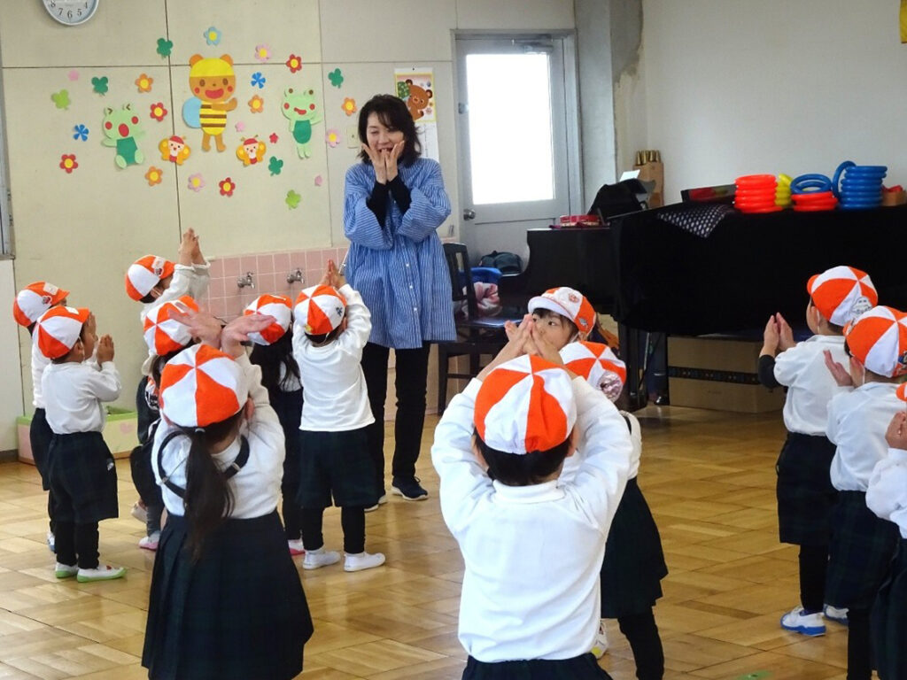 週に一度の専門教諭によるリトミックでは、音やリズムを身体で感じ、身体を動かしたり、表現したりします。音感やリズム感だけでなく、想像力や表現力、集中力なども育まれます。ピアニカ、カスタネット、太鼓など打楽器にも触れながら、音楽の楽しさを体感し、感性を磨いていきます。