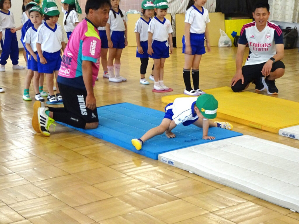 週に一度の専門教諭による体操指導では、マット運動、跳び箱、平均台、鉄棒などを使って、幼児期に育成することがのぞましい、敏捷性(びんしょうせい)や巧緻性(こうちせい)、柔軟性などを養い、楽しく基礎体力の向上をめざします。季節によって、プール、ボール運動、なわとびなども行います。日常の保育の中でも、鬼ごっこ、ボールあそびなど、幼児期に必要な身体を思い切り動かす活動をたくさんとり入れています。